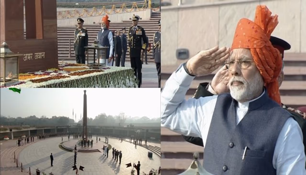 ಇಂದು ಬೆಳಗ್ಗೆ ರಾಷ್ಟ್ರೀಯ ಯುದ್ಧ ಸ್ಮಾರಕಕ್ಕೆ ಭೇಟಿ ನೀಡಿದ್ದ ಪ್ರಧಾನಿ ಮೋದಿ, ಸಾಮಪ್ರದಾಯಿಕ ಕೇಸರಿ ಬಂದೇಜ್’ನ್ನು ಧರಿಸಿದ್ದು, ಇದು ರಾಜಸ್ಥಾನ ಹಾಗೂ ಗುಜರಾತ್’ನಲ್ಲಿ ಜನಪ್ರಿಯವಾಗಿದೆ.