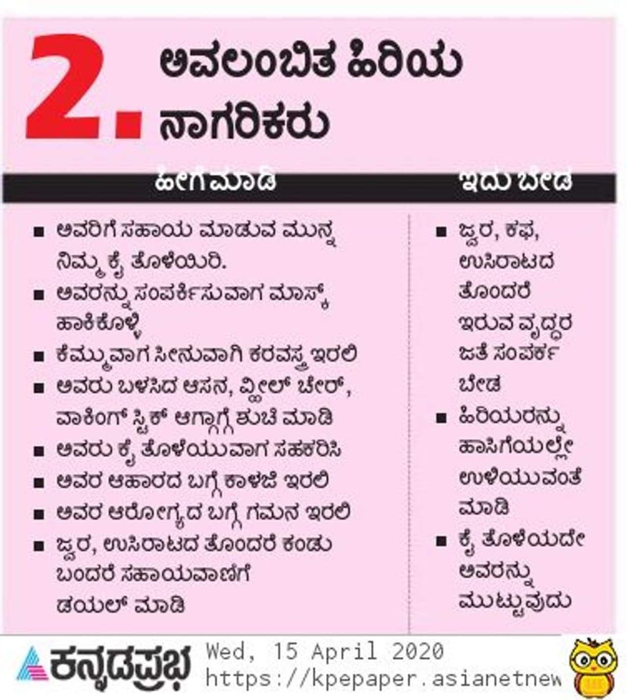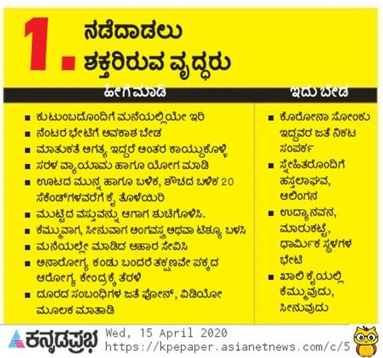 ಇದರ ಮುಂದುವರೆದ ಭಾಗವಾಗಿ ವೃದ್ಧರು ತಮ್ಮನ್ನು ತಾವು ಹೇಗೆ ಸೋಂಕು ಹರಡುವುದರಿಂದ ಕಾಪಾಡಿಕೊಳ್ಳಬೇಕು ಮತ್ತು ವೃದ್ಧ ಪೋಷಕರನ್ನು ಮಕ್ಕಳು ಮತ್ತು ಸಂಬಂಧಿಗಳು ಹೇಗೆ ಕಾಪಾಡಿಕೊಳ್ಳಬೇಕು, ಸರ್ಕಾರಗಳು ಹೇಗೆ ಈ ನಿಟ್ಟಿನಲ್ಲಿ ಎಚ್ಚರಿಕೆ ವಹಿಸಬೇಕು ಎಂಬುದರ ಬಗ್ಗೆ ಕೇಂದ್ರ ಸರ್ಕಾರ ಮಂಗಳವಾರ ಮತ್ತಷ್ಟುಮಾರ್ಗಸೂಚಿಗಳನ್ನು ಬಿಡುಗಡೆ ಮಾಡಿದೆ. ಅವುಗಳ ಪ್ರಮುಖಾಂಶ ಹೀಗಿದೆ.