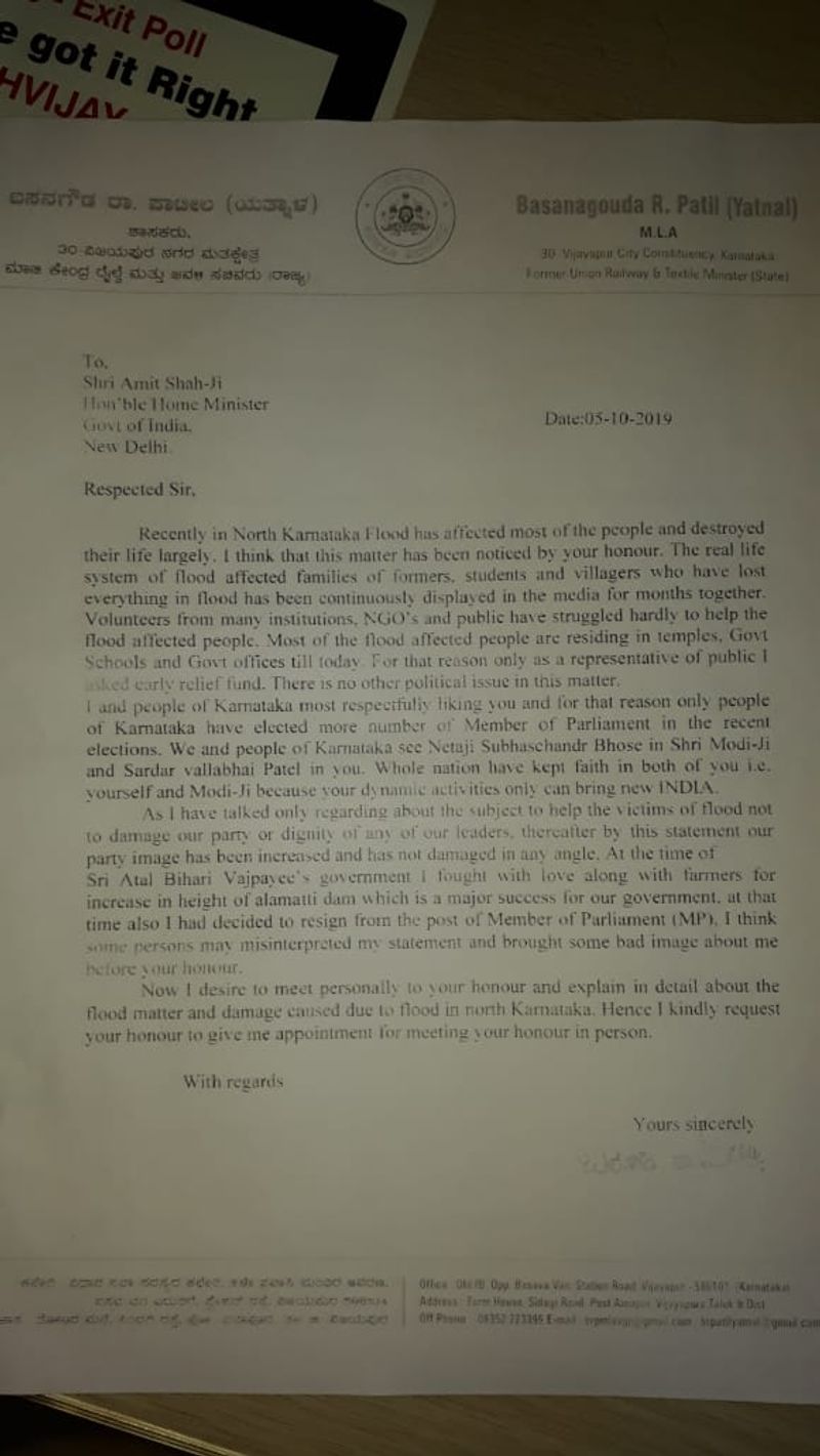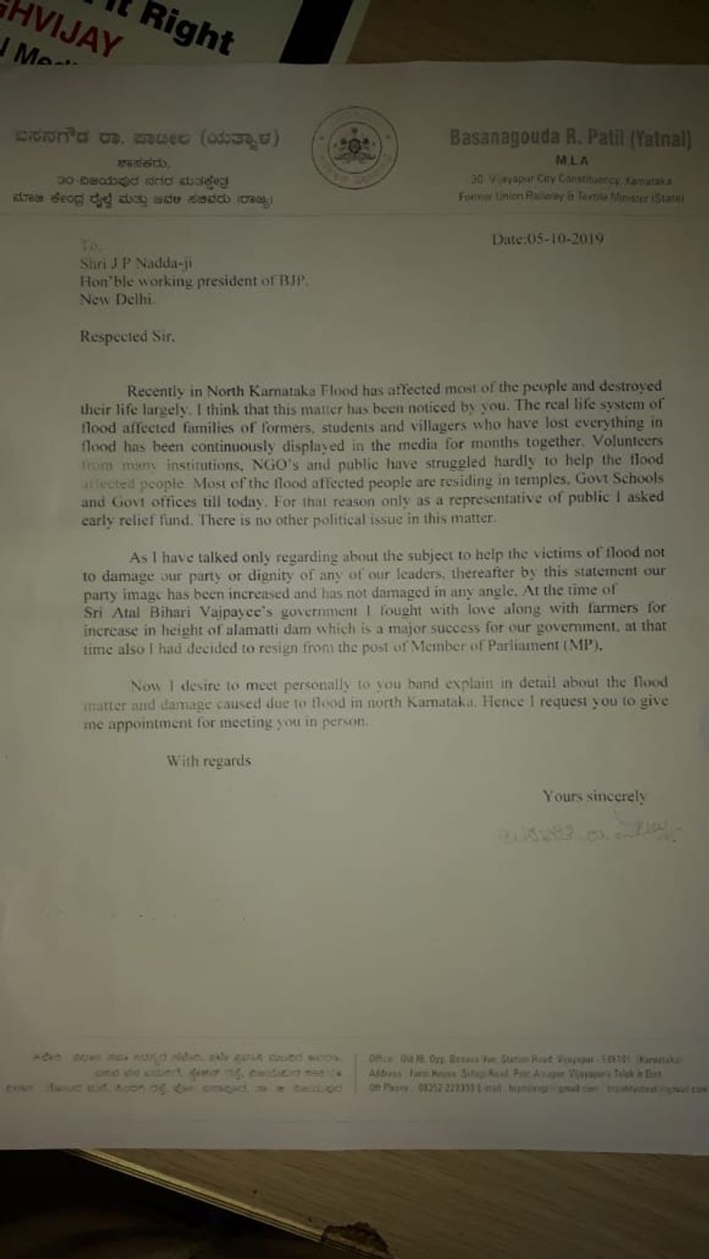 ಪ್ರಧಾನಿ ಮೋದಿ ಅವರಿಗೆ ಪತ್ರ ಬರೆದ ಯತ್ನಾಳ್/ ನಾನು ಪಕ್ಷದ ವಿರುದ್ಧವಾಗಿ ಎಲ್ಲಿಯೂ ಮಾತನಾಡಿಲ್ಲ/ ನನ್ನಿಂದ ಪಕ್ಷದ ಘನತೆಗೆ ಧಕ್ಕೆ ಆಗಿಲ್ಲ/ ನೆರೆ ಸಂತ್ರಸ್ತರ ನೆರವಿಗೆ ನಿಂತಿದ್ದೇನೆ