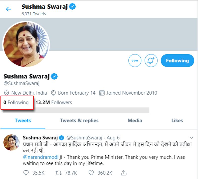 ಆದರೆ 13.2 ಮಿಲಿಯನ್ ಫಾಲೋವರ್ಸ್ ಹೊಂದಿದ್ದ ಸುಷ್ಮಾ ಮಾತ್ರ ಯಾರನ್ನೂ ಫಾಲೋ ಮಾಡುತ್ತಿರಲಿಲ್ಲ ಎಂಬುವುದು ಬಹಳ ಅಚ್ಚರಿ ಮೂಡಿಸುವಂತಹುದ್ದು. ಹೌದು ಅವರ ಟ್ವಿಟರ್ ಖಾತೆ ತೆರೆದರೆ ಅಲ್ಲಿ ಅವರು ಫಾಲೋ ಮಾಡುತ್ತಿದ್ದವರ ಸಂಖ್ಯೆ 0 ಎಂಬುವುದನ್ನು ಕಾಣಬಹುದು.