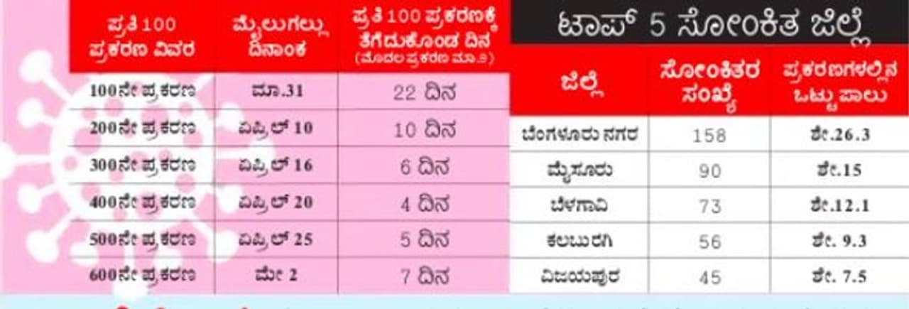 ಇನ್ನು ರಾಜ್ಯವನ್ನು ತೀವ್ರವಾಗಿ ಕಾಡುತ್ತಿರುವ ನಂಜನಗೂಡು ಔಷಧ ಕಾರ್ಖಾನೆ ಸೋಂಕು ಪ್ರಕರಣದಲ್ಲಿ 76 ಮಂದಿಗೆ ಸೋಂಕು ಉಂಟಾಗಿದ್ದರೆ, 53 ಮಂದಿ ಗುಣಮುಖರಾಗಿದ್ದಾರೆ. ಅಲ್ಲದೆ, ಪ್ರತಿ 100 ಸೋಂಕಿನ ಪ್ರಕರಣಗಳು ದಾಖಲಾದ ದಿನಗಳ ಅವಧಿ ಹೆಚ್ಚುತ್ತಾ ಬಂದಿದೆ. 300 ರಿಂದ 400ನೇ ಪ್ರಕರಣಗಳು ಕೇವಲ 4 ದಿನದಲ್ಲಿ ವರದಿಯಾಗಿತ್ತು. 400ರಿಂದ 500ನೇ ಪ್ರಕರಣಕ್ಕೆ 5 ದಿನ, 500ನೇ ಪ್ರಕರಣದಿಂದ 600ನೇ ಪ್ರಕರಣಕ್ಕೆ 7 ದಿನ ಸಮಯ ತೆಗೆದುಕೊಂಡಿದೆ. ಇದು ರಾಜ್ಯದ ಮಟ್ಟಿಗೆ ತಕ್ಕಮಟ್ಟಿಗೆ ಆತಂಕ ದೂರ ಮಾಡಿದೆ. ಆದರೆ, ಮೇ 4ರ ಲಾಕ್ಡೌನ್ ಸಡಿಲಿಕೆಯಿಂದಾಗಿ ಸಾರ್ವಜನಿಕರು ಮತ್ತಷ್ಟುಎಚ್ಚರಿಕೆಯಿಂದ ಇರಬೇಕಿದೆ ಎಂದು ಹಿರಿಯ ಅಧಿಕಾರಿಯೊಬ್ಬರು ಸಲಹೆ ನೀಡಿದರು.