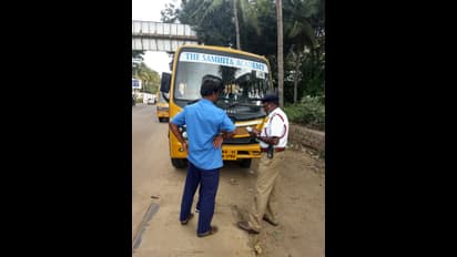 ಬೆಂಗಳೂರು[ಜು.16] ಪೋಷಕರೇ ಶಾಲಾ ವಾಹನಗಳಲ್ಲಿ ನಿಮ್ಮ ಮಕ್ಕಳನ್ನು ಕಳುಹಿಸುತ್ತಿದ್ದೀರಾ? ಹುಷಾರ್...! ಹುಷಾರ್...! ಈ ಸುದ್ದಿಯನ್ನು ಗಮನವಿಟ್ಟು ಓದಿ, ಸಂಚಾರಿ ನಿಯಮಗಳನ್ನ ಉಲ್ಲಂಘನೆ ಮಾಡುತ್ತಿದ್ದ ಶಾಲಾ ವಾಹನಗಳಿಗೆ ಪೊಲೀಸರು ದಂಡ ವಿಧಿಸಿ ಎಚ್ಚರಿಕೆ ನೀಡಿದ್ದಾರೆ.