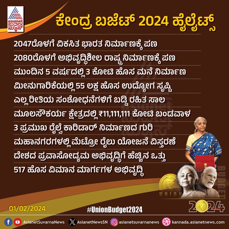 ಈ ಮೊದಲೇ ತಿಳಿಸಿದಂತೆ ವಿತ್ತ ಸಚಿವೆ ನಿರ್ಮಲಾ ಸೀತರಾಮನ್ ಅವರು ಯಾವುದೇ ಭರ್ಜರಿ ಘೋಷಣೆಗಳನ್ನೂ ಮಾಡಿಲ್ಲ. ಮಧ್ಯಂತರ ಬಜೆಟ್ ಇದಾಗಿದ್ದು, ಚುನಾವಣೆ ಗಮನದಲ್ಲಿಟ್ಟುಕೊಂಡು ಮತ ಸೆಳೆಯಲು ಏನಾದರೂ ಹೊಸ ಘೋಷಣೆ ಇರಬಹುದೆಂದು ಅಂದಾಜಿಸಲಾಗಿತ್ತು. ಆದರೆ, ಯಾವುದೇ ಫ್ರೀ ಘೋಷಣೆಯೂ ಇಲ್ಲ. ಕೇಂದ್ರ ಬಜೆಟ್ನಲ್ಲಿ ಯುವ ಜನಾಂಗದ ಅಭಿವೃದ್ಧಿ ಅವರ ಸಂಶೋಧನೆ ಆವಿಷ್ಕಾರಗಳಿಗೆ ನೆರವು ನೀಡುವ ನಿಟ್ಟಿನಲ್ಲಿ ಕೆಲ ಘೋಷಣೆಗಳನ್ನು ಮಾಡಲಾಗಿದ್ದರೆ, ಮಹಿಳಾ ಕಲ್ಯಾಣದ ನಿಟ್ಟಿನಲ್ಲಿ 'ಲಖ್ಪತಿ ದೀದಿ' ಸೇರಿದಂತೆ ಗೆಲುವು ಯೋಜನೆಗಳನ್ನು ಘೋಷಣೆ ಮಾಡಿದೆ. ಒಟ್ಟಾರೆಯಾಗಿ ಇದೊಂದು ಭರವಸೆಯ ಬಜೆಟ್ ಆಗಿದ್ದು, ಮುಂದಿನ ಜುಲೈನಲ್ಲಿ ವಿಕಸಿತ ಭಾರತದ ನೀಲನಕ್ಷೆಯ ಬಜೆಟ್ ಮಂಡಿಸುವುದಾಗಿ ನಿರ್ಮಲಾ ಸೀತಾರಾಮನ್ ತಿಳಿಸಿದ್ದಾರೆ.