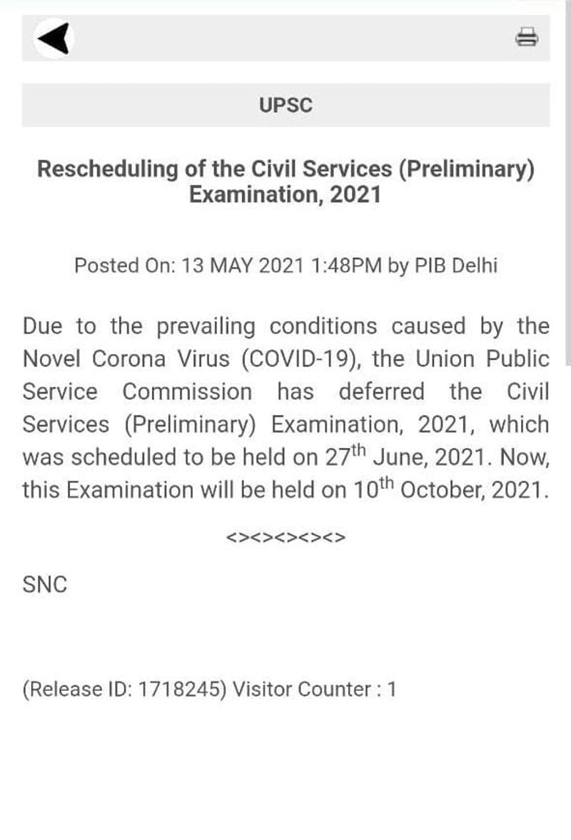 ಸದ್ಯದ ಕೊರೋನಾ ಪರಿಸ್ಥಿಯಲ್ಲಿ ಪರೀಕ್ಷೆ ನಡೆಸಲು ಅಸಾಧ್ಯವಾಗಿದ್ದು ಅಕ್ಟೋಬರ್ 10 ರಂದು ನಡೆಸುವ ತೀರ್ಮಾನ ಮಾಡಲಾಗಿದೆ ಎಂದು ಪ್ರಕಟಣೆ ತಿಳಿಸಿದೆ. ಭಾರತೀಯ ಆಡಳಿತಾತ್ಮಕ ಸೇವೆ(ಐಎಎಸ್), ಭಾರತೀಯ ವಿದೇಶಾಂಗ ಸೇವೆ(ಐಎಫ್ ಎಸ್), ಭಾರತೀಯ ಪೊಲೀಸ್ ಸೇವೆ(ಐಪಿಎಸ್) ಮತ್ತು ಇತರ ಇಲಾಖೆಗಳ ನೇಮಕಾತಿ ಪರೀಕ್ಷೆ ನಿಗದಿಯಾಗಿತ್ತು.