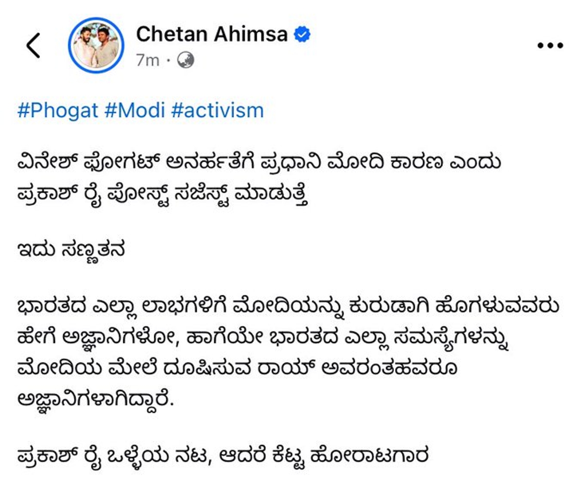 ಈ ಕುರಿತು ಸಾಮಾಜಿಕ ಜಾಲತಾಣದಲ್ಲಿ ಪೋಸ್ಟ್ ಹಂಚಿಕೊಂಡಿರುವ ಅವರು, ವಿನೇಶ್ ಫೋಗಟ್ ಅನರ್ಹತೆಗೆ ಪ್ರಧಾನಿ ಮೋದಿ ಕಾರಣ ಎಂದು ಪ್ರಕಾಶ್ ರೈ ಪೋಸ್ಟ್ ಸಜೆಸ್ಟ್ ಮಾಡುತ್ತದೆ. ಇದು ಸಣ್ಣತನ ಭಾರತದ ಎಲ್ಲಾ ಲಾಭಗಳಿಗೆ ಮೋದಿಯನ್ನು ಕುರುಡಾಗಿ ಹೊಗಳುವವರು ಹೇಗೆ ಅಜ್ಞಾನಿಗಳೋ, ಹಾಗೆಯೇ ಭಾರತದ ಎಲ್ಲಾ ಸಮಸ್ಯೆಗಳನ್ನು ಮೋದಿಯ ಮೇಲೆ ದೂಷಿಸುವ ರಾಯ್ ಅವರಂತಹವರೂ ಅಜ್ಞಾನಿಗಳಾಗಿದ್ದಾರೆ. ಪ್ರಕಾಶ್ ರೈ ಒಳ್ಳೆಯ ನಟ, ಆದರೆ ಕೆಟ್ಟ ಹೋರಾಟಗಾರ' ಎಂದು ಟೀಕೆ ಮಾಡಿದ್ದಾರೆ.