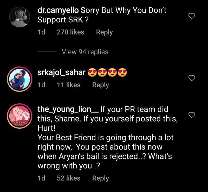 ನಾವು ನಿಮ್ಮ ಕಡೆಯಿಂದ ಸಾಮಾಜಿಕ ಮಾಧ್ಯಮದಲ್ಲಿ ಶಾರೂಖ್ ಬಗ್ಗೆ ಏನನ್ನೂ ನೋಡಲಿಲ್ಲ. ನಾನು ನಿಮ್ಮ ಅಭಿಮಾನಿಯಾಗಿದ್ದೆ ಆದರೆ ಈಗ.. ಎಂದು ಮೌನವಾಗಿದ್ದಾರೆ. ಇನ್ನೊಬ್ಬ ನಿರಾಶೆಗೊಂಡ ಅಭಿಮಾನಿ ಅಸಮಾಧಾನದಿಂದ ನಿಮ್ಮ PR ತಂಡವು ಇದನ್ನು ಮಾಡಿದರೆ, ನಾಚಿಕೆ. ನೀವೇ ಇದನ್ನು ಪೋಸ್ಟ್ ಮಾಡಿದರೆ, ಹರ್ಟ್! ನಿಮ್ಮ ಉತ್ತಮ ಸ್ನೇಹಿತರು ಈಗ ಸಾಕಷ್ಟು ತೊಂದರೆ ಅನುಭವಿಸುತ್ತಿದ್ದಾರೆ. ಆರ್ಯನ್ಗೆ ಜಾಮೀನು ತಿರಸ್ಕರಿಸಿರುವಾಗ ನೀವು ಈ ಬಗ್ಗೆ ಹೇಗೆ ಪೋಸ್ಟ್ ಮಾಡುತ್ತೀರಿ .. ? ಏನಾಗಿದೆ ನಿಮಗೆ..? ಎಂದು ಪ್ರಶ್ನಿಸಿದ್ದಾರೆ.