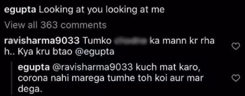 ನೆಟ್ಟಿಗ ಮಾಡಿದ ಕಾಮೆಂಟ್ ಇನ್ಸ್ಟಾಗ್ರಾಂ ಪೋಸ್ಟಿಂದ ಮಾಯವಾಗಿದೆ ಈ ವಿಚಾರ ವೈರಲ್ ಆಗುತ್ತಿದ್ದಂತೆ ಆತನೇ ಕಾಮೆಂಟ್ ಡಿಲೀಟ್ ಮಾಡಿದ್ದಾನೆ ಎನ್ನಲಾಗಿದೆ. ಆದರೆ ಕಾಮೆಂಟ್ ಫೋಟೋ ಎಲ್ಲೆಡೆ ವೈರಲ್ ಆಗುತ್ತಿದೆ. ಕ್ಲೋಸಪ್ ಫೋಟೋಗೆ ಇಶಾ 'Looking at you looking at me' ಎಂದು ಬರೆದುಕೊಂಡಿದ್ದಾರೆ.