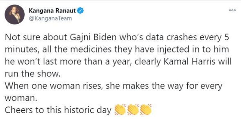 5 ನಿಮಿಷಕ್ಕೊಮ್ಮೆ ಡಾಟಾ ಚೇಂಜ್ ಆಗುವ ಗಜನಿ ಬೈಡನ್ ಬಗ್ಗೆ ನಂಬಿಕೆ ಇಲ್ಲ. ಖಂಡಿತವಾಗಿಯೂ ಕಮಲಾ ಶೋ ಮುನ್ನಡೆಸ್ತಾರೆ. ಒಬ್ಬ ಮಹಿಳೆ ಮೇಲೆ ಬಂದಾಗ ಆಕೆ ಉಳಿದೆಲ್ಲರಿಗೂ ದಾರಿ ಮಾಡಿಕೊಡುತ್ತಾಳೆ. ಐತಿಹಾಸಿಕ ದಿನಕ್ಕೆ ಚಿಯರ್ಸ್ ಎಂದಿದ್ದಾರೆ. ಕಂಗನಾ ಅಮೆರಿಕ ಅಧ್ಯಕ್ಷ ಜಾಯ್ ಬೈಡನ್ ಅವರನ್ನು ಅಮೀರ್ ಖಾನ್ ನಟನೆಯ ಗಜನಿ ಸಿನಿಮಾ ಪಾತ್ರಕ್ಕೆ ಹೋಲಿಸಿದ್ದಾರೆ.