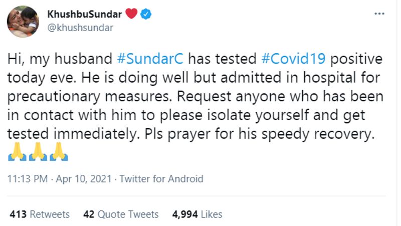 ಕ್ವಾರಂಟೈನ್ನಲ್ಲಿರುವ ಕಾರಣ ಕೆಲವು ದಿನಗಳ ಕಾಲ ವಿಡಿಯೋ ಕಾನ್ಫರೆನ್ಸ್ ಮೂಲಕ ಪಕ್ಷದ ಮುಖಂಡರು ಹಾಗೂ ಸಿನಿಮಾ ತಂಡದ ಜೊತೆ ಸಂಪರ್ಕದಲ್ಲಿರುತ್ತಾರೆ ಎಂಬ ಮಾಹಿತಿ ತಿಳಿದು ಬಂದಿದೆ. ಇನ್ನೂ ಖುಷ್ಬೂ ಪತಿ ನಿರ್ದೇಶಕ ಸುಂದರ್ಗೆ ಕೊರೋನಾ ಪಾಸಿಟಿವ್ ಎಂದು ತಿಳಿದು ಬಂದಿದೆ. 'ಸುಂದರ್ ಆರೋಗ್ಯವಾಗಿದ್ದಾರೆ. ವೈದ್ಯರು ನೀಡಿರುವ ಸಲಹೆಯಿಂದ ಆಸ್ಪತ್ರೆ ಸೇರಿದ್ದಾರೆ. ಕೆಲವು ದಿನಗಳಿಂದ ಅವರ ಸಂಪರ್ಕದಲ್ಲಿದ್ದವರು ದಯವಿಟ್ಟು ಪರೀಕ್ಷೆ ಮಾಡಿಸಿಕೊಳ್ಳಿ,' ಎಂದು ಟ್ಟೀಟ್ ಮಾಡುವ ಮೂಲಕ ನಟಿ ಖುಷ್ಬೂ ಮನವಿ ಮಾಡಿಕೊಂಡಿದ್ದಾರೆ.