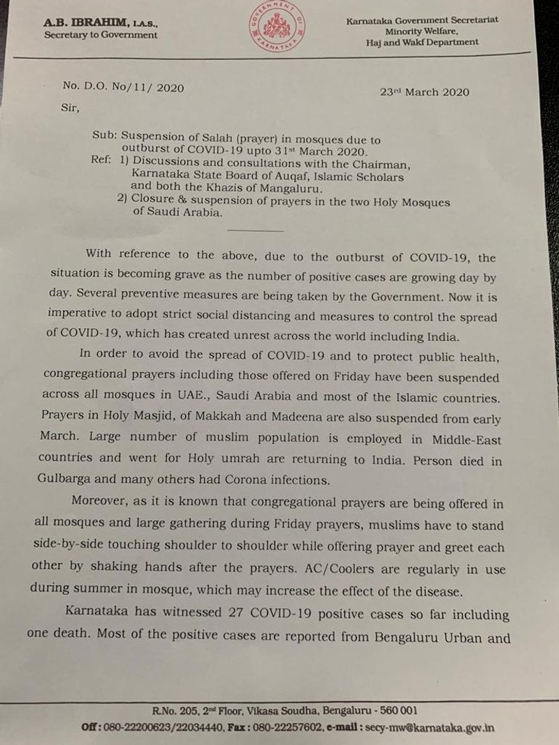 ಮುಸ್ಲಿಂ ಬಾಂಧವರು ನಮಾಜ಼್ ವೇಳೆ ಅಕ್ಕ ಪಕ್ಕದಲ್ಲಿ ಕೂಡುತ್ತಾರೆ. ಬಳಿಕ ಹಸ್ತಲಾಘವ ಮಾಡಿ, ಕೈ ಕುಲುಕರ್ನಾಟಕ ವಕ್ಫ್ ಬೋರ್ಡ್ ಹಾಗೂ ಇಸ್ಲಾಮಿಕ್ ಸ್ಕಾಲರ್ ಹಾಗೂ ಧಾರ್ಮಿಕ ಮುಖಂಡರ ಜೊತೆ ಚರ್ಚಿಸಿದ ಬಳಿಕ ಈ ನಿರ್ಧಾರಕ್ಕೆ ಕಲಾಗುತ್ತದೆ. ಇದರಿಂದ ಕೊರೋನಾ ಹರಡುವ ಸಾಧ್ಯತೆ ಇದೆ. ಹೀಗಾಗಿ ರಾಜ್ಯ ಸರ್ಕಾರ ಈ ಮಹತ್ವದ ನಿರ್ಣಯವನ್ನ ತೆಗೆದುಕೊಂಡಿದೆ.