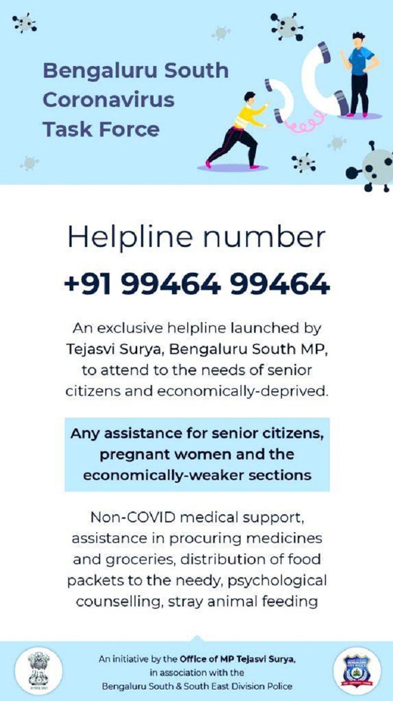 ಹಿರಿಯ ನಾಗರಿಕರು, ಗರ್ಬಿಣಿ ಮಹಿಳೆಯರು ಮತ್ತು ಆರ್ಥಿಕವಾಗಿ ಹಿಂದುಳಿದಿರುವವರು 9946499464 ನಂಬರ್ಗೆ ಕರೆ ಮಾಡಬೇಕಾಗಿ ಸೌತ್ ಕೊರೋನಾ ಟಾಸ್ಕ್ ಫೋರ್ಸ್ ಪ್ರಕಟನೆಯಲ್ಲಿ ತಿಳಿಸಿದೆ. ಪ್ರಮುಖವಾಗಿ ಔಷಧಿ ಸಾಮಗ್ರಿಗಳು, ದಿನ ಬಳಕೆಯ ಅಗತ್ಯ ಸಾಮಾನು-ಸರಂಜಾಮುಗಳು, ಆಹಾರ ಪೊಟ್ಟಣಗಳ ಸರಬರಾಜು, ಮಾನಸಿಕ ಸಮಾಲೋಚನೆ, ಸಾಕು ಪ್ರಾಣಿಗಳಿಗೆ ಆಹಾರ ಪೂರೈಕೆ ಸೇವೆಗಳಿಗೆ ಕರೆ ಮಾಡಬಹುದಾಗಿದೆ. ಇದರ ಜತೆಗೆ 2 ಆಂಬ್ಯುಲೆನ್ಸ್ಗಳು ಸೇವೆಗೆ ಸಿದ್ದವಿದ್ದು, ಸಹಾಯವಾಣಿಗೆ ಕರೆ ಮಾಡಿ ಪ್ರಯೋಜನ ಪಡೆದುಕೊಳ್ಳಲು ತಿಳಿಸಿದೆ.