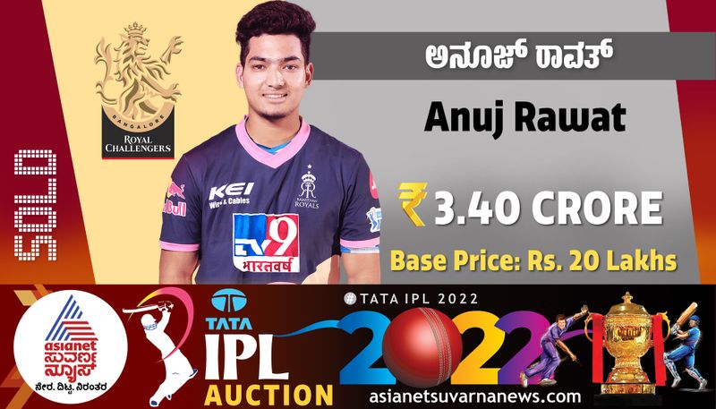 ದಿನೇಶ್ ಕಾರ್ತಿಕ್ಗೆ ಬ್ಯಾಕ್ ಅಪ್ ವಿಕೆಟ್ ಕೀಪರ್ ಆಗಿ ರಾಯಲ್ ಚಾಲೆಂಜರ್ಸ್ ಬೆಂಗಳೂರು ತಂಡ ಅನೂಜ್ ರಾವತ್ ಖರೀದಿ ಮಾಡಿದೆ. 20 ಲಕ್ಷ ರೂಪಾಯಿ ಮೂಲ ಬೆಲೆಯ ಅನೂಜ್ ರಾವತ್ಗೆ ರಾಯಲ್ ಚಾಲೆಂಜರ್ಸ್ ಬೆಂಗಳೂರು 3.40 ಕೋಟಿ ರುಪಾಯಿ ನೀಡಿದೆ. ಉತ್ತರಖಂಡದ ಕ್ರಿಕೆಟಿಗ ಅನೂಜ್ ರಾವತ್ ಕಳೆದ ಐಪಿಎಲ್ ಟೂರ್ನಿಯಲ್ಲಿ ರಾಜಸ್ಥಾನ ರಾಯಲ್ಸ್ ಮೂಲಕ ಪದಾರ್ಪಣೆ ಮಾಡಿದ್ದಾರೆ.