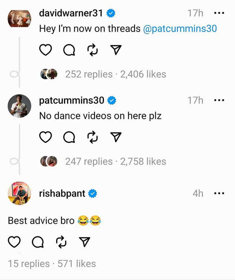 ಇನ್ನು ಥ್ರೆಡ್ಸ್ ಆ್ಯಪ್ಸ್ಗೆ ಎಂಟ್ರಿಕೊಟ್ಟ ಬಳಿಕ ಡೇವಿಡ್ ವಾರ್ನರ್, ತಾವು ಥ್ರೆಡ್ ಆ್ಯಪ್ಸ್ಗೆ ಬಂದಿದ್ದೇನೆ ಎಂದು ಆಸ್ಟ್ರೇಲಿಯ ನಾಯಕ ಪ್ಯಾಟ್ ಕಮಿನ್ಸ್ ಅವನ್ನು ಟ್ಯಾಗ್ ಮಾಡಿದ್ದಾರೆ. ಇದರ ಬೆನ್ನಲ್ಲೇ ಡೇವಿಡ್ ವಾರ್ನರ್ಗೆ ಆಸ್ಟ್ರೇಲಿಯಾ ನಾಯಕ ಪ್ಯಾಟ್ ಕಮಿನ್ಸ್ ಸ್ಪೆಷಲ್ ರಿಕ್ವೆಸ್ಟ್ ಮಾಡಿಕೊಂಡಿದ್ದಾರೆ. "ದಯವಿಟ್ಟು ಇಲ್ಲಿ ಡ್ಯಾನ್ಸ್ ವಿಡಿಯೋಗಳನ್ನು ಹಾಕಬೇಡಿ" ಎಂದು ಡೇವಿಡ್ ವಾರ್ನರ್ ಬಳಿ ಪ್ಯಾಟ್ ಕಮಿನ್ಸ್ ಮನವಿ ಮಾಡಿಕೊಂಡಿದ್ದಾರೆ. ಇದನ್ನು ಗಮನಿಸಿದ ಟೀಂ ಇಂಡಿಯಾ ವಿಕೆಟ್ ಕೀಪರ್ ಬ್ಯಾಟರ್ ರಿಷಭ್ ಪಂತ್, ಇದು ಅತ್ಯುತ್ತಮವಾದ ಸಲಹೆಯಾಗಿದೆ ಬ್ರದರ್ ಎಂದು ಕಾಮೆಂಟ್ ಮಾಡುವ ಮೂಲಕ ಈ ಚಾಟ್ಗೆ ಮತ್ತಷ್ಟು ಮೈಲೇಜ್ ಸಿಗುವಂತೆ ಮಾಡಿದ್ದಾರೆ.
