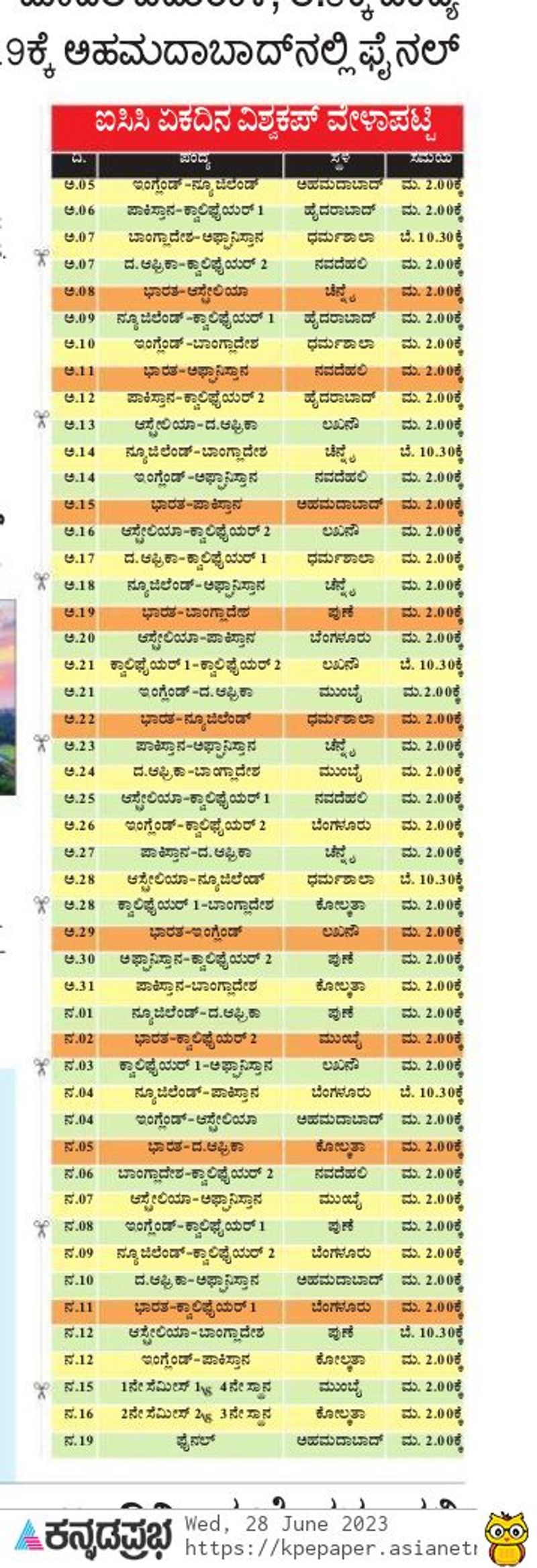 ಐಸಿಸಿ ಏಕದಿನ ವಿಶ್ವಕಪ್ ಟೂರ್ನಿಯ ಸಂಪೂರ್ಣ ವೇಳಾಪಟ್ಟಿ ಇಲ್ಲಿದೆ:
