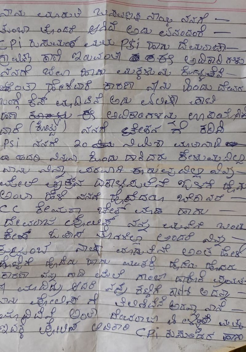 ಸಿಪಿಐ ಕುಸುಮಾಧರ್, ಪಿಎಸ್ಐ ಹಾಗೂ ಸಿಬ್ಬಂದಿ ದೇವರಾಜ್ ದೌರ್ಜನ್ಯದಿಂದ ನಾನು ಜೀವ ಕೊಡುತ್ತಿದ್ದೇನೆ. ನಾನು ನನ್ನ ದೇಶ, ಧರ್ಮವನ್ನು ಪ್ರೀತಿಸ್ತೇನೆ... ಅದು ನನ್ನ ತಪ್ಪಾ...? ನಾನು ಹೇಡಿಯಲ್ಲ, ಹೇಡಿಯಾಗಿದ್ರೆ ಈ ಕೆಲಸ ಮಾಡ್ತಿರ್ಲಿಲ್ಲ. ನನ್ನ ಮಕ್ಕಳಿಗಾಗಿ ನಾನು ಈ ಕೆಲಸ ಮಾಡ್ತಿದ್ದೇನೆ. ನನ್ನನ್ನು ಕ್ಷಮಿಸಿ..ಈ ಲೆಟರ್ ಅನ್ನು ಶಂಕರ್ ಅಣ್ಣಾನತ್ರ ಕೊಟ್ಟುಬಿಡಿ. ಇದಕ್ಕೆಲ್ಲಾ ಕಾರಣ ಸಿಪಿಐ ಕುಸುಮಾಧರ್, ಪಿಎಸ್ಐ, ದೇವರಾಜ ಹಾಗೂ ಎಲಿಷಾ ಎಲಕಪಾಟಿ. ನನ್ನ ಜನರಲ್ಲಿ ನಾನು ಕ್ಷಮೆ ಕೋರ್ತೇನೆ, ನಾನು ಮತ್ತೆ ಹುಟ್ಟಿ ಬರ್ತೇನೆ. ರಾಧಾ ನನ್ನನ್ನು ಕ್ಷಮಿಸಿ ಪ್ಲೀಸ್, ನಿನ್ನಂತ ಹೆಂಡತಿ ಪಡೆಯಲು ಪುಣ್ಯ ಮಾಡಿರಬೇಕು. ನಾನು ಸತ್ರೆ ಎಲ್ಲಾ ಸರಿಯಾಗುತ್ತೆ, ಶಂಕರ ಅಣ್ಣನತ್ರ ಹೇಳು ನನ್ನ ಸುಡು ಅಂತಾ, ಯಾಕಂದ್ರೆ ಅವನ ಬಿಟ್ರೆ ನನಗೆ ಯಾರೂ ಇಲ್ಲ. 100 ಜನುಮಕೂ ನೀನು ಬೇಕು, I love you Radha ಎಂದು ಡೆತ್ನೋಟ್ ಬರೆದಿಟ್ಟು ಮಾರುತಿ ನಾಯ್ಕ್ ಆತ್ಮಹತ್ಯೆ ಮಾಡಿಕೊಂಡಿದ್ದಾನೆ.