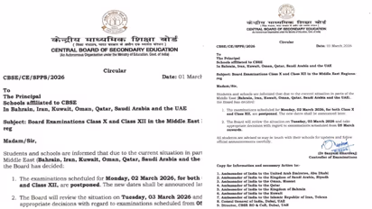 ನವದೆಹಲಿ: ಮಧ್ಯಪ್ರಾಚ್ಯದ ಕೆಲವು ಭಾಗಗಳಲ್ಲಿ ಯುದ್ಧ ಭೀತಿ ಮತ್ತು ಭದ್ರತಾ ಅಸ್ಥಿರತೆ ತೀವ್ರಗೊಂಡಿರುವ ಹಿನ್ನೆಲೆಯಲ್ಲಿ, ಕೇಂದ್ರೀಯ ಮಾಧ್ಯಮಿಕ ಶಿಕ್ಷಣ ಮಂಡಳಿ (CBSE) ಮಹತ್ವದ ತೀರ್ಮಾನ ಕೈಗೊಂಡಿದೆ. ಮಾರ್ಚ್ 02, 2026 ರಂದು ಮಧ್ಯಪ್ರಾಚ್ಯದ ಹಲವು ದೇಶಗಳಲ್ಲಿ ನಡೆಯಬೇಕಿದ್ದ 10ನೇ ತರಗತಿ ಮತ್ತು 12ನೇ ತರಗತಿಯ ಬೋರ್ಡ್ ಪರೀಕ್ಷೆಗಳನ್ನು ತಾತ್ಕಾಲಿಕವಾಗಿ ಮುಂದೂಡುವುದಾಗಿ ಮಂಡಳಿ ಘೋಷಿಸಿದೆ.