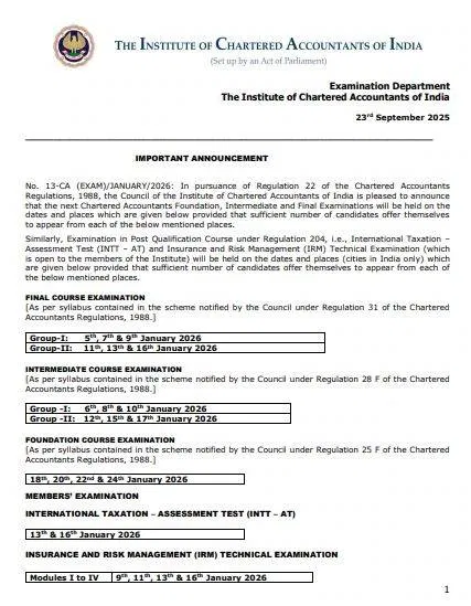 ಗ್ರೂಪ್ 1 ರ ಇಂಟರ್ಮೀಡಿಯೇಟ್ ಕೋರ್ಸ್ ಪರೀಕ್ಷೆಯು ಜನವರಿ 6, 8 ಮತ್ತು 10, 2026 ರಂದು ಮತ್ತು ಗ್ರೂಪ್ 2 ರ ಇಂಟರ್ಮೀಡಿಯೇಟ್ ಕೋರ್ಸ್ ಪರೀಕ್ಷೆಯು ಜನವರಿ 12, 15 ಮತ್ತು 17, 2026 ರಂದು ನಡೆಯಲಿದೆ. ಅದೇ ರೀತಿ, ಫೌಂಡೇಶನ್ ಕೋರ್ಸ್ ಪರೀಕ್ಷೆಯು ಜನವರಿ 18, 20, 22 ಮತ್ತು 24, 2026 ರಂದು ನಡೆಯಲಿದೆ. ಅಂತರರಾಷ್ಟ್ರೀಯ ತೆರಿಗೆ-ಮೌಲ್ಯಮಾಪನ ಪರೀಕ್ಷೆಯು ಜನವರಿ 13 ಮತ್ತು 16, 2025 ರಂದು ಮತ್ತು ವಿಮೆ ಮತ್ತು ಅಪಾಯ ನಿರ್ವಹಣಾ ತಾಂತ್ರಿಕ ಪರೀಕ್ಷೆಯು ಜನವರಿ 9, 11, 13 ಮತ್ತು 16, 2026 ರಂದು ನಡೆಯಲಿದೆ.