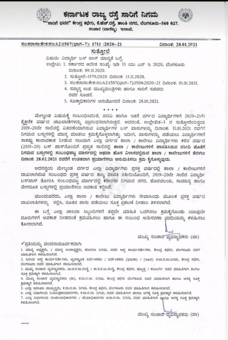 ಶಾಲಾ ಕಾಲೇಜು ವಿದ್ಯಾರ್ಥಿಗಳಿಗೆ ಹಳೆ ಬಸ್ ಪಾಸ್ ನಲ್ಲೇ ಓಡಾಟ ನಡೆಸಲು ಅವಕಾಶ ಮಾಡಿಕೊಡಲಾಗಿದೆ 2020- 21 ನೇ ಸಾಲಿನ ಶಾಲಾ ಕಾಲೇಜು ಆರಂಭವಾದ ಕಾರಣಕ್ಕೆ ಫೆಬ್ರವರಿ 28 ರವರೆಗೆ ಹಳೆ ಬಸ್ ಪಾಸ್ ನಲ್ಲೇ ಸಂಚರಿಸಲು ಅವಕಾಶ ಮಾಡಿಕೊಡಲಾಗಿದೆ.