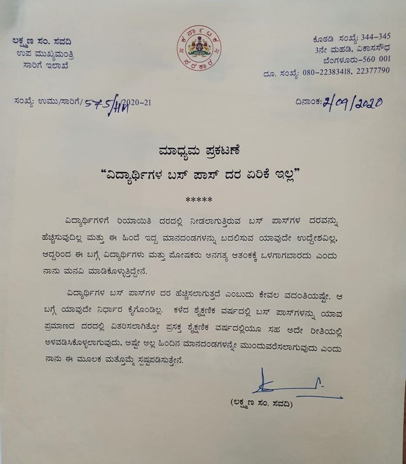 ಬೆಂಗಳೂರು, (ಸೆ.02): ವಿದ್ಯಾರ್ಥಿಗಳ ಬಸ್ಪಾಸ್ ದರದಲ್ಲಿ ಹೆಚ್ಚಳ ಮಾಡುವುದಿಲ್ಲ ಎಂದು ಸಾರಿಗೆ ಸಚಿವ ಲಕ್ಷ್ಮಣ ಸವದಿ ಸ್ಪಷ್ಟನೆ ಕೊಟ್ಟಿದ್ದಾರೆ.