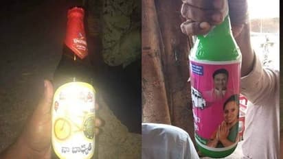 ಆಂಧ್ರ ಪ್ರದೇಶದಲ್ಲಿ ಟಿಡಿಪಿ ಹಾಗೂ ವೈಎಸ್ಆರ್ ಕಾಂಗ್ರೆಸ್ ಪಕ್ಷದ ಸ್ಟಿಕರ್ ಅಂಟಿಸಿರುವ ಮದ್ಯದ ಬಾಟಲಿಗಳನ್ನು ರಾರಯಲಿಗಳಲ್ಲಿ ಭಾಗವಹಿಸುವ ಜನರಿಗೆ ಹಂಚಲಾಗಿದೆ. ತೆಲಂಗಾಣದಲ್ಲಿ ಗುಲಾಬಿ ಬಣ್ಣದ ಸ್ಟಿಕರ್ ಹಾಗೂ ಅಭ್ಯರ್ಥಿಗಳು ಮುಖಂಡರ ಫೋಟೋ ಇರುವ ಮದ್ಯದ ಬಾಟಲಿಗಳು ಕಂಡು ಬರುತ್ತಿವೆ. ಹೀಗಾಗಿ ಮದ್ಯದ ಬಾಟಲಿ ಹಂಚಿದವರು ಯಾವ ಪಕ್ಷದವರು ಎನ್ನುವುದನ್ನು ಸುಲಭವಾಗಿ ಗುರುತಿಸಬಹುದಾಗಿದೆ.