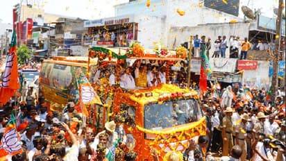 ಭದ್ರಾವತಿ[ಏ.21]: ಶಿವಮೊಗ್ಗ ಲೋಕಸಭಾ ಕ್ಷೇತ್ರದ ಬಿಜೆಪಿ ಅಭ್ಯರ್ಥಿ ಬಿ.ವೈ.ರಾಘವೇಂದ್ರ ಪರವಾಗಿ ಪಕ್ಷದ ರಾಷ್ಟ್ರೀಯ ಅಧ್ಯಕ್ಷ ಅಮಿತ್ ಶಾ ಅವರು ಭದ್ರಾವತಿ ಪಟ್ಟಣದಲ್ಲಿ ಶನಿವಾರ ರೋಡ್ ಶೋ ನಡೆಸಿ ಮತಯಾಚನೆ ಮಾಡಿದರು.
