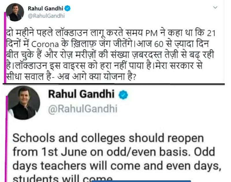 ಹೀಗಿರುವಾಗ ಕಾಂಗ್ರೆಸ್ ನಾಯಕ ರಾಹುಲ್ ಗಾಂಧಿ, ‘ಜೂನ್ 1ರಿಂದ ಸಮ-ಬೆಸ ಸಂಖ್ಯೆಯಾಧರಿಸಿ ಶಾಲಾ ಕಾಲೇಜುಗಳನ್ನು ಆರಂಭಿಸಿ. ಬೆಸ ಸಂಖ್ಯೆಯ ದಿನದಂದು ಶಿಕ್ಷಕರು ಶಾಲೆಗೆ ಬರಲಿ, ಸಮ ಸಂಖ್ಯೆಯ ದಿನ ಮಕ್ಕಳು ಶಾಲೆಗೆ ಬರಲಿ’ ಎಂದು ಟ್ವೀಟ್ ಮಾಡಿದ್ದಾರೆ ಎನ್ನಲಾದ ಸ್ಕ್ರೀನ್ಶಾಟ್ ಸಾಮಾಜಿಕ ಜಾಲತಾಣಗಳಲ್ಲಿ ವೈರಲ್ ಆಗುತ್ತಿದೆ.