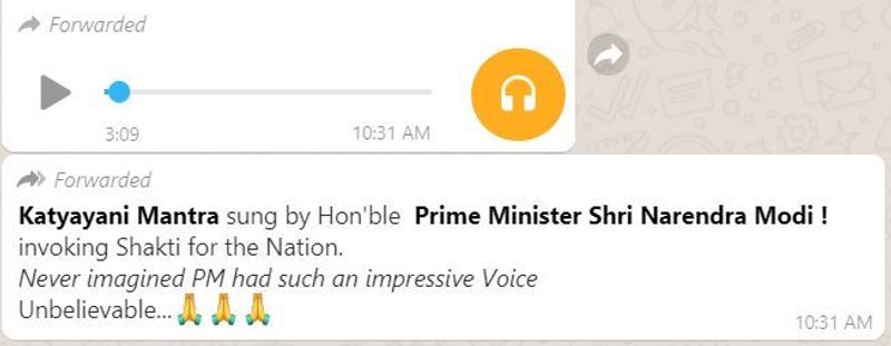 ನವದೆಹಲಿ(ಏ.30): ಪ್ರಧಾನಿ ನರೇಂದ್ರ ಮೋದಿ ಕಾತ್ಯಾಯಿನಿ ಮಂತ್ರ ಪಠಿಸಿದ್ದಾರೆ ಎಂಬ ಸಂದೇಶ ವೊಂದು ಸಾಮಾಜಿಕ ಜಾಲತಾಣಗಳಲ್ಲಿ ಹರಿದಾಡುತ್ತಿದೆ. ಕಾತ್ಯಾಯಿನಿ ಮಂತ್ರ ಪಠಿಸಿರುವ ಆಡಿಯೋ ಕ್ಲಿಪ್ವೊಂದನ್ನು ಪೋಸ್ಟ್ ಮಾಡಿ, ‘ಇಡೀ ದೇಶಕ್ಕೆ ದುಷ್ಟಶಕ್ತಿಯ ವಿರುದ್ಧ ಹೋರಾಡುವ ಶಕ್ತಿಯನ್ನು ಕೋರಿ ಪ್ರಧಾನಿ ನರೇಂದ್ರ ಮೋದಿ ಕಾತ್ಯಾಯಿನಿ ಮಂತ್ರವನ್ನು ಪಠಿಸಿದ್ದಾರೆ. ಇಷ್ಟೊಂದು ಶುಶ್ರಾವ್ಯವಾಗಿ ಮೋದಿ ಹಾಡುತ್ತಾರೆಂದು ನಂಬಲೇ ಸಾಧ್ಯವಾಗುತ್ತಿಲ್ಲ’ ಎನ್ನಲಾಗುತ್ತಿದೆ. ಇದೀಗ ವೈರಲ್ ಆಗುತ್ತಿದೆ.