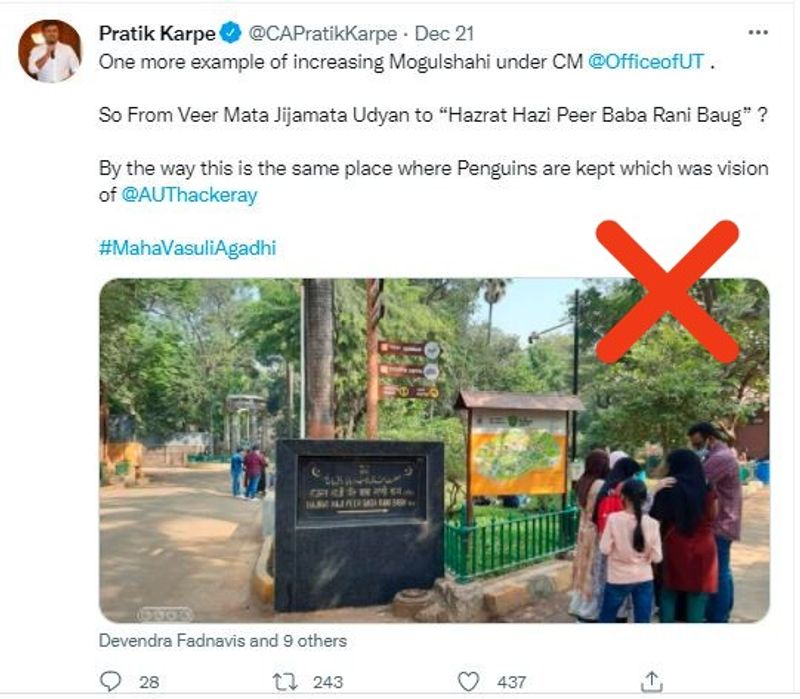 ಮರಾಠಿಯಲ್ಲಿ ಟ್ವೀಟ್ ಮಾಡಿದ್ದು, "ರಾಣಿ ಬಾಗ್ನ ಒಂದು ತುದಿಯಲ್ಲಿ ಹಜರತ್ ಹಾಜಿ ಪೀರ್ ಬಾಬಾ ರಾಣಿಬಾಗ್ವಾಲೆ ಎಂದು ಕರೆಯಲ್ಪಡುವ ದರ್ಗಾವಿದೆ. 1861 ರಲ್ಲಿ ರಾಣಿ ಬಾಗ್ ಅನ್ನು ಸ್ಥಾಪಿಸಿದಾಗಿನಿಂದ ಈ ದರ್ಗಾ ಅಲ್ಲಿಯೇ ಇದೆ. ಫೋಟೋದಲ್ಲಿರುವ ಬೋರ್ಡ್ ದರ್ಗಾದ ದಾರಿಗಾಗಿ ಕೇವಲ ನಿರ್ದೇಶನ ಫಲಕವಾಗಿದೆ" ಎಂದು ಹೇಳಿದೆ.
