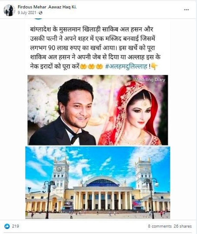 Claim: ಸಾಮಾಜಿಕ ಮಾಧ್ಯಮದಲ್ಲಿ ಅನೇಕರು ಈ ಫೋಟೋವನ್ನು ಹಂಚಿಕೊಂಡಿದ್ದು “ಬಾಂಗ್ಲಾದೇಶಿ ಕ್ರಿಕೆಟಿಗ ಶಕೀಬ್ ಅಲ್ ಹಸನ್ ಮತ್ತು ಅವರ ಪತ್ನಿ ತಮ್ಮ ನಗರದಲ್ಲಿ ಮಸೀದಿಯನ್ನು ನಿರ್ಮಿಸಿದ್ದಾರೆ, ಇದಕ್ಕೆ ಸುಮಾರು 90 ಲಕ್ಷ ರೂಪಾಯಿ ವೆಚ್ಚವಾಗಿದೆ. ಶಕೀಬ್ ಅಲ್ ಹಸನ್ ತಮ್ಮ ಜೇಬಿನಿಂದ ಅದನ್ನು ಪಾವತಿಸಿದ್ದಾರೆ. ಅಲ್ಲಾಹನು ಅವರ ಉದಾತ್ತ ಉದ್ದೇಶಗಳನ್ನು ಪೂರೈಸಲಿ! ” ಎಂದು ಹೇಳಲಾಗಿದೆ.