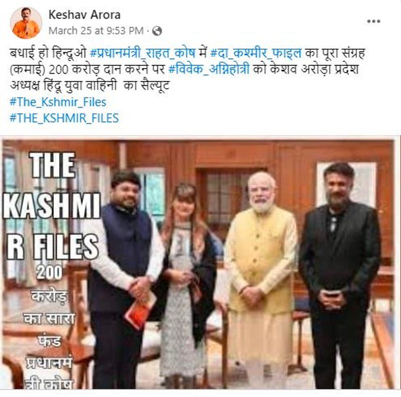 Claim: "ಅಭಿನಂದನೆಗಳು ಹಿಂದೂಗಳೇ, ಪ್ರಧಾನಿ ಪರಿಹಾರ ನಿಧಿಗೆ ದಿ ಕಶ್ಮೀರ ಫೈಲ್ಸ್ 200 ಕೋಟಿಗಳ ಸಂಪೂರ್ಣ ಸಂಗ್ರಹವನ್ನು (ಗಳಿಕೆಯ) ದೇಣಿಗೆ ನೀಡಿದ ವಿವೇಕ್ ಅಗ್ನಿಹೋತ್ರಿಯವರಿಗೆ, ಕೇಶವ ಅರೋರಾ ರಾಜ್ಯಾಧ್ಯಕ್ಷ ಹಿಂದೂ ಯುವ ವಾಹಿನಿಯ ವಂದನೆಗಳು" ಎಂಬ ಹೇಳಿಕೆಯೊಂದಿಗೆ ದಿ ಕಾಶ್ಮೀರ್ ಫೈಲ್ಸ್ ತಂಡವು ಪ್ರಧಾನಿ ನರೇಂದ್ರ ಮೋದಿ ಜತೆಗಿರುವ ಫೋಟೋ ಸಾಮಾಜಿಕ ಜಾಲತಾಣಗಳಲ್ಲಿ ವೈರಲ್ ಮಾಡಲಾಗಿದೆ. ಇದೇ ಮಾದರಿಯಲ್ಲಿ ಹಲವು ಫೋಸ್ಟ್ಗಳು ಫೇಸ್ಬುಕ್ ಸೇರಿದಂತೆ ಸಾಮಾಜಿಕ ಜಾಲತಾಣಗಳಲ್ಲಿ ವೈರಲ್ ಆಗಿವೆ.