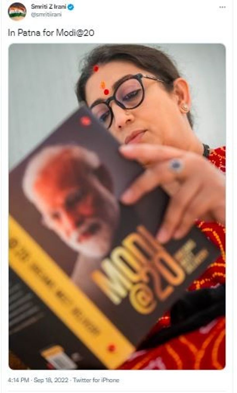 ಸ್ಮೃತಿ ಇರಾನಿ ವೇರಿಫೈಡ್ ಟ್ವಿಟರ್ ಖಾತೆಯಲ್ಲಿ ಹಂಚಿಕೊಂಡಿರುವ ಮೂಲ ಫೋಟೋದಲ್ಲಿ ಅವರು ಪ್ರಧಾನಿ ನರೇಂದ್ರ ಮೋದಿಯವರ ಸಾರ್ವಜನಿಕ ಜೀವನವನ್ನು ಆಧರಿಸಿದ 'Modi@20: Dreams meet Delivery' (ಮೋದಿ@20: ಡ್ರೀಮ್ಸ್ ಮೀಟ್ ಡೆಲಿವರಿ) ಎಂಬ ಶೀರ್ಷಿಕೆಯ ಪುಸ್ತಕವನ್ನು ಓದುತ್ತಿದ್ದಾರೆ. 18 ಸೆಪ್ಟೆಂಬರ್ 2022 ರಂದು ಪುಸ್ತಕದ ಹಿಂದಿ ಆವೃತ್ತಿಯ ಬಿಡುಗಡೆ ಕಾರ್ಯಕ್ರಮಕ್ಕಾಗಿ ಬಿಹಾರದ ಪಾಟ್ನಾದಲ್ಲಿದ್ದಾಗ ಅವರು ಈ ಫೋಟೋವನ್ನು ಹಂಚಿಕೊಂಡಿದ್ದರು.