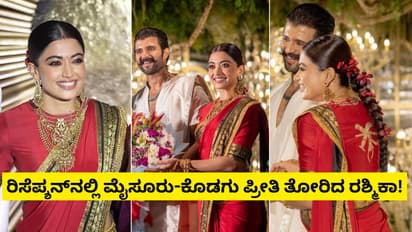ರಿಸೆಪ್ಷನ್ಗಾಗಿ ರಶ್ಮಿಕಾ ಮಂದಣ್ಣ, ಮೈಸೂರಿನ 'ಗಂಡಭೇರುಂಡ' ಮತ್ತು ಕೊಡವ ಸಂಸ್ಕೃತಿಯ 'ಪಿಚಕತ್ತಿ' ವಿನ್ಯಾಸಗಳಿದ್ದ ಕೆಂಪು ಮೈಸೂರು ಸಿಲ್ಕ್ ಸೀರೆ ಧರಿಸಿದ್ದರು. ಆಭರಣಗಳು ಮತ್ತು ಸಾಂಪ್ರದಾಯಿಕ ಅಲಂಕಾರದಲ್ಲಿ ಅವರು ಕಂಗೊಳಿಸಿದರೆ, ವಿಜಯ್ ದೇವರಕೊಂಡ ಕೂಡ 'ಗಜ-ಕೇಸರಿ' ವಿನ್ಯಾಸದ ಉಡುಪಿನಲ್ಲಿ ಮಿಂಚಿದರು.
