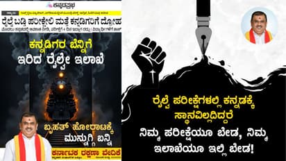 ರೈಲ್ವೆ ಇಲಾಖೆಯ ಪದೋನ್ನತಿ ಪರೀಕ್ಷೆಗಳನ್ನು ಕೇವಲ ಹಿಂದಿ ಮತ್ತು ಇಂಗ್ಲಿಷ್ನಲ್ಲಿ ನಡೆಸುತ್ತಿರುವುದನ್ನು ವಿರೋಧಿಸಿ ಕರ್ನಾಟಕ ರಕ್ಷಣಾ ವೇದಿಕೆ ಬೃಹತ್ ಹೋರಾಟಕ್ಕೆ ಕರೆ ನೀಡಿದೆ. ಈ ಹಿನ್ನೆಲೆಯಲ್ಲಿ, ಕರವೇ ರಾಜ್ಯಾಧ್ಯಕ್ಷ ಟಿ.ಎ. ನಾರಾಯಣಗೌಡರಿಗೆ ಪೊಲೀಸ್ ಇಲಾಖೆ ನೋಟಿಸ್ ಜಾರಿ ಮಾಡಿದೆ.