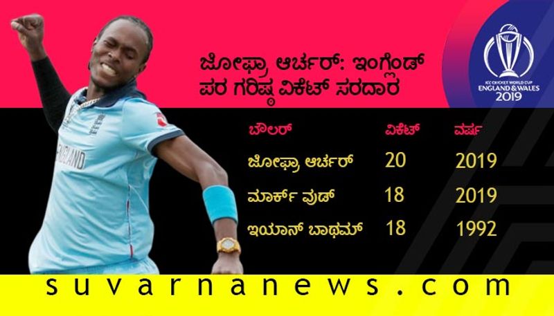 ಬಾರ್ಬೋಡಸ್ ಮೂಲದ ಇಂಗ್ಲೆಂಡ್ ವೇಗಿ ಜೋಫ್ರಾ ಆರ್ಚರ್ 20 ವಿಕೆಟ್ ಕಬಳಿಸುವುದರೊಂದಿಗೆ, ವಿಶ್ವಕಪ್ ಟೂರ್ನಿಯಲ್ಲಿ ಇಂಗ್ಲೆಂಡ್ ಪರ ಗರಿಷ್ಠ ವಿಕೆಟ್ ಪಡೆದ ವೇಗಿ ಎನ್ನುವ ದಾಖಲೆ ಬರೆದಿದ್ದಾರೆ.