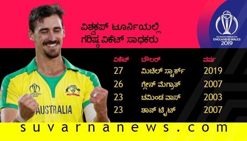 ವಿಶ್ವಕಪ್ ಟೂರ್ನಿಯೊಂದರಲ್ಲಿ ಗರಿಷ್ಠ ವಿಕೆಟ್ ಪಡೆದ ಬೌಲರ್ ಎನ್ನುವ ದಾಖಲೆ ಇದೀಗ ಆಸೀಸ್ ಎಡಗೈ ವೇಗಿ ಮಿಚೆಲ್ ಸ್ಟಾರ್ಕ್ ಪಾಲಾಗಿದೆ. 2019ರ ಏಕದಿನ ವಿಶ್ವಕಪ್ ಟೂರ್ನಿಯಲ್ಲಿ ಸ್ಟಾರ್ಕ್ 27 ವಿಕೆಟ್ ಕಬಳಿಸುವ ಮೂಲಕ ತಮ್ಮದೇ ದೇಶದವರಾದ ಗ್ಲೇನ್ ಮೆಗ್ರಾತ್ ದಾಖಲೆ ಅಳಿಸಿಹಾಕಿದ್ದಾರೆ.