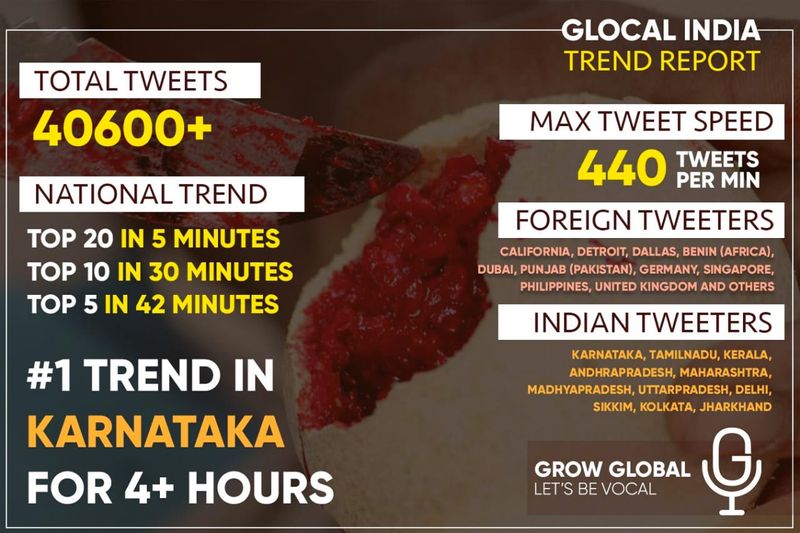 ವಿಶೇಷವೆಂದರೆ ಟ್ರೆಂಡ್ ಪ್ರಾರಂಭಿಸಿದ ಐದೇ ನಿಮಿಷದಲ್ಲಿ ರಾಷ್ಟ್ರೀಯ ಮಟ್ಟದಲ್ಲಿ ಟಾಪ್ 20 ಯಲ್ಲಿ #Glocal_India ಕಾಣಿಸಿಕೊಂಡಿತು. ಅಭಿಯಾನ ಪ್ರಾರಂಭಿಸಿದ ಕೇವಲ 45 ನಿಮಿಷಗಳೊಳಗೆ ರಾಷ್ಟ್ರ ಮಟ್ಟದಲ್ಲಿ ಮೊದಲ ಐದರ ಸ್ಥಾನದಲ್ಲಿತ್ತು #Glocal_India.