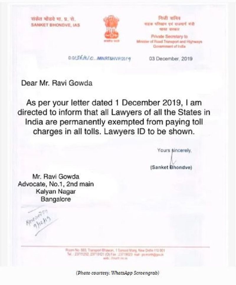 ನ್ಯಾಯಾಧೀಶರು ಮತ್ತು ವಕೀಲರು ರಾಷ್ಟ್ರೀಯ ಹೆದ್ದಾರಿಗಳಲ್ಲಿ ಟೋಲ್ ಕಟ್ಟಬೇಕಿಲ್ಲ ಎಂಬ ಸಂದೇಶ ಸಾಮಾಜಿಕ ಜಾಲತಾಣಗಳಲ್ಲಿ ಹರಿದಾಡುತ್ತಿದೆ. ರಸ್ತೆ ಮತ್ತು ಸಾರಿಗೆ ಸಚಿವರ ಖಾಸಗಿ ಸೆಕ್ರೆಟರಿ ಸಂಕೇತ್ ಬೋಡ್ವೆ ಅವರ ಹೆಸರಿನಲ್ಲಿ ಪತ್ರವನ್ನು ಪೋಸ್ಟ್ ಮಾಡಿ, ‘ವಾವ್!! ಭಾರತಾದ್ಯಂತ ವಕೀಲರು ಟೋಲ್ ಕಟ್ಟಬೇಕಿಲ್ಲ. ಆದರೆ ಮಾಜಿ ವಕೀಲರಿಗೂ ಇದು ಅನ್ವಯಿಸುತ್ತದೆಯೇ?’ ಎಂದು ಪ್ರಶ್ನಿಸಿ ಒಕ್ಕಣೆ ಬರೆಯಲಾಗಿದೆ. ಇದೀಗ ವಾಟ್ಸ್ಆ್ಯಪ್ ಮತ್ತು ಫೇಸ್ಬುಕ್ಗಳಲ್ಲಿ ವೈರಲ್ ಆಗುತ್ತಿದೆ.