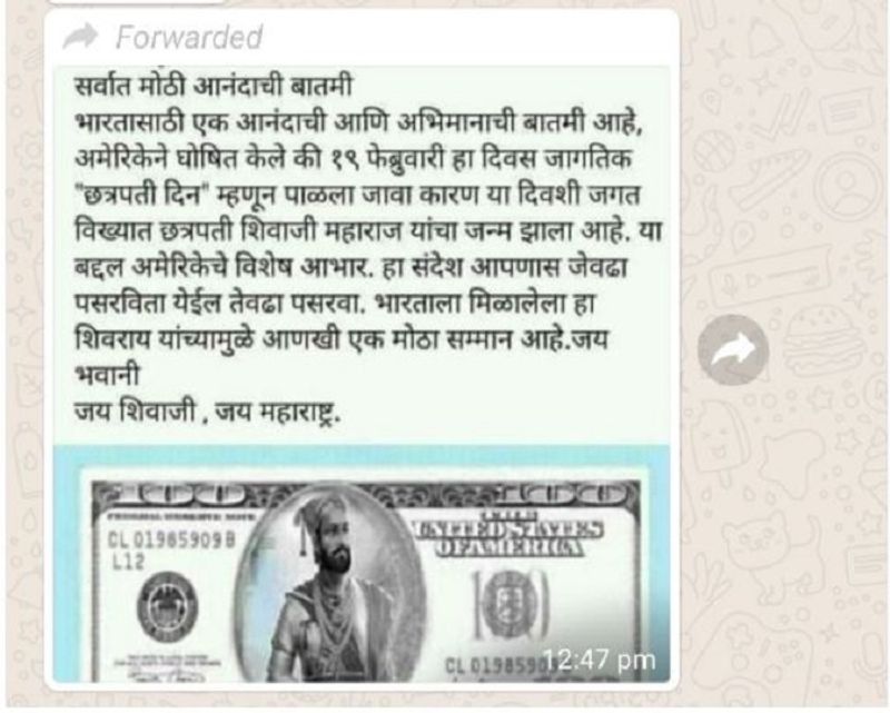 ಅಮೆರಿಕ ಫೆಬ್ರವರಿ 15ನ್ನು ಛತ್ರಪತಿ ಶಿವಾಜಿ ದಿನ ಎಂದು ಘೋಷಿಸಿದೆ ಎನ್ನುವ ಸಂದೇಶ ಸಾಮಾಜಿಕ ಜಾಲತಾಣಗಳಲ್ಲಿ ವೈರಲ್ ಆಗುತ್ತಿದೆ. ಇದರೊಂದಿಗೆ 100 ಡಾಲರ್ ನೋಟಿನ ಮೇಲೆ ಶಿವಾಜಿ ಚಿತ್ರವಿರುವ ಫೋಟೋವನ್ನೂ ಲಗತ್ತಿಸಲಾಗಿದೆ.
