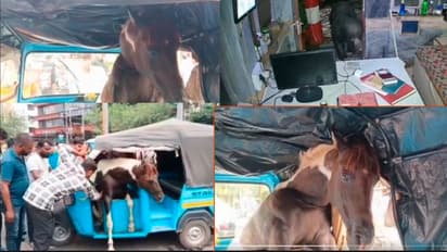 ಕಿತ್ತಾಡುತ್ತಾ ಚಲಿಸುವ ಆಟೋದೊಳಗೆ ನುಗ್ಗಿದ ಕುದುರೆ: