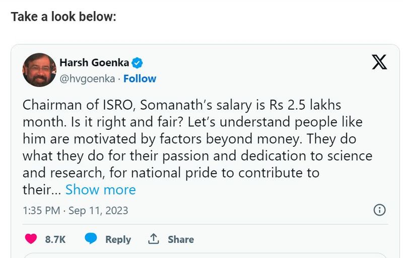 ಇಸ್ರೋ ಮುಖ್ಯಸ್ಥರ (ISRO chief) ತಿಂಗಳ ಸಂಬಳ 2.5 ಲಕ್ಷ ರೂಪಾಯಿಯಾಗಿದ್ದು, ಇದು ಸರಿಯೇ ನ್ಯಾಯ ಸಮ್ಮತ್ತವೇ? ಇವರಂತಹ ವ್ಯಕ್ತಿಗಳು ಹಣಕ್ಕಿಂತ ಮುಖ್ಯವಾಗಿ ಕೆಲವು ಬೇರೆ ವಿಚಾರಗಳಿಂದ ಪ್ರೇರಿತರಾಗಿದ್ದಾರೆ ಎಂಬುದನ್ನು ನಾವು ಅರ್ಥ ಮಾಡಿಕೊಳ್ಳಬೇಕು. ಅವರು ಹಣದ ಮುಖ ನೋಡದೇ ತಮ್ಮ ಆಸಕ್ತಿ, ವಿಜ್ಞಾನ ಹಾಗೂ ಸಂಶೋಧನೆಯ ವಿಷಯದಲ್ಲಿ ಸಮರ್ಪಣೆ ಜೊತೆಗೆ ತಮ್ಮ ದೇಶಕ್ಕೆ ಕೊಡುಗೆ ನೀಡಲು ಅವರು ಹೆಮ್ಮೆ ಪಡುತ್ತಾರೆ. ಈ ಸಾಧನೆಯ ಮೂಲಕ ಅವರು ತಮ್ಮ ವೈಯಕ್ತಿಕ ಆಸಕ್ತಿಯನ್ನು ನೆರವೇರಿಸಿಕೊಳ್ಳುತ್ತಾರೆ. ಅವರಂತಹ ದೇಶಕ್ಕಾಗಿ ಸಮರ್ಪಿತವಾದ ವ್ಯಕ್ತಿಗಳಿಗೆ ನಾನು ತಲೆ ಬಾಗುತ್ತೇನೆ ಎಂದು ಹರ್ಷ ಗೋಯಂಕಾ ಬರೆದುಕೊಂಡಿದ್ದಾರೆ.