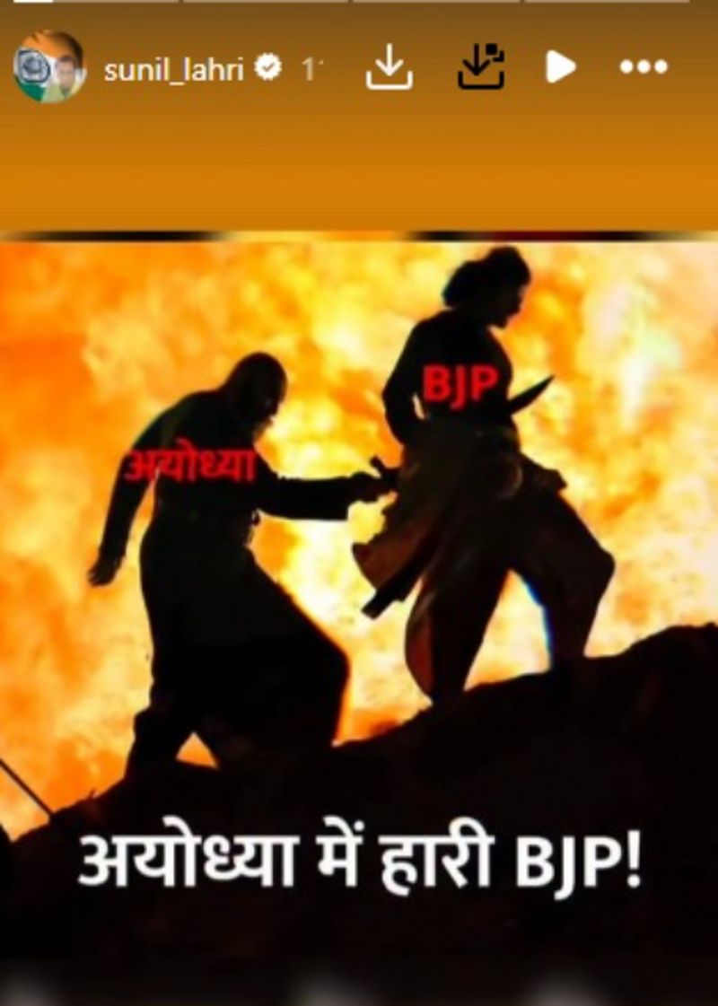 ತಮ್ಮ ಇನ್ಸ್ಟಾಗ್ರಾಮ್ ಸ್ಟೋರೀಸ್ನಲ್ಲಿ, ಕಟ್ಟಪ್ಪ ಬಾಹುಬಲಿಯನ್ನು ಕೊಲ್ಲುವ ಸಾಂಪ್ರದಾಯಿಕ ಬಾಹುಬಲಿ ದೃಶ್ಯದ ಚಿತ್ರವನ್ನು ಸುನಿಲ್ ಹಂಚಿಕೊಂಡಿದ್ದಾರೆ. ಬಾಹುಬಲಿ ಮೇಲೆ ಬಿಜೆಪಿ ಎಂದು ಬರೆದಿದ್ದರೆ ಕಟ್ಟಪ್ಪನನ್ನು ಅಯೋಧ್ಯೆ ಎಂದು ಬರೆದಿದ್ದಾರೆ.