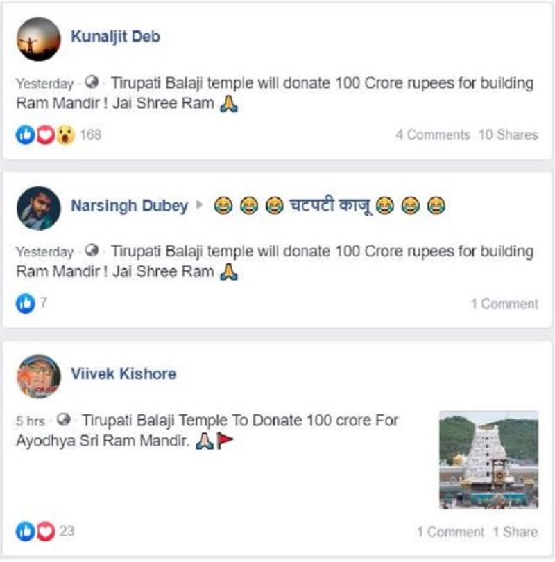 ಆದರೆ ನಿಜಕ್ಕೂ ಅಯೋಧ್ಯೆಯಲ್ಲಿ ರಾಮಮಂದಿರ ನಿರ್ಮಾಕ್ಕೆ ತಿರುಪತಿ ದೇವಸ್ಥಾನದ ವತಿಯಿಂದ ಇಷ್ಟೊಂದು ದೊಡ್ಡ ಮಟ್ಟದ ಹಣ ನೀಡಲಾಗುತ್ತಿದೆಯೇ ಎಂದು ಬೂಮ್ ಪರಿಶೀಲನೆಗೆ ಮುಂದಾದಾಗ ಇದೊಂದು ಸುಳ್ಳುಸುದ್ದಿ ಎಂಬುದು ಸ್ಪಷ್ಟವಾಗಿದೆ. ದೇವಾಲಯ ಆಡಳಿತ ಮಂಡಳಿಯು ಈ ವಿಚಾರವನ್ನು ಅಲ್ಲಗಳೆದಿದ್ದು, ಈ ಬಗ್ಗೆ ಇನ್ನೂ ಯಾವುದೇ ನಿರ್ಧಾರ ತೆಗೆದುಕೊಂಡಿಲ್ಲ ಎಂದು ಸ್ಪಷ್ಟನೆ ನಿಡಿದೆ.