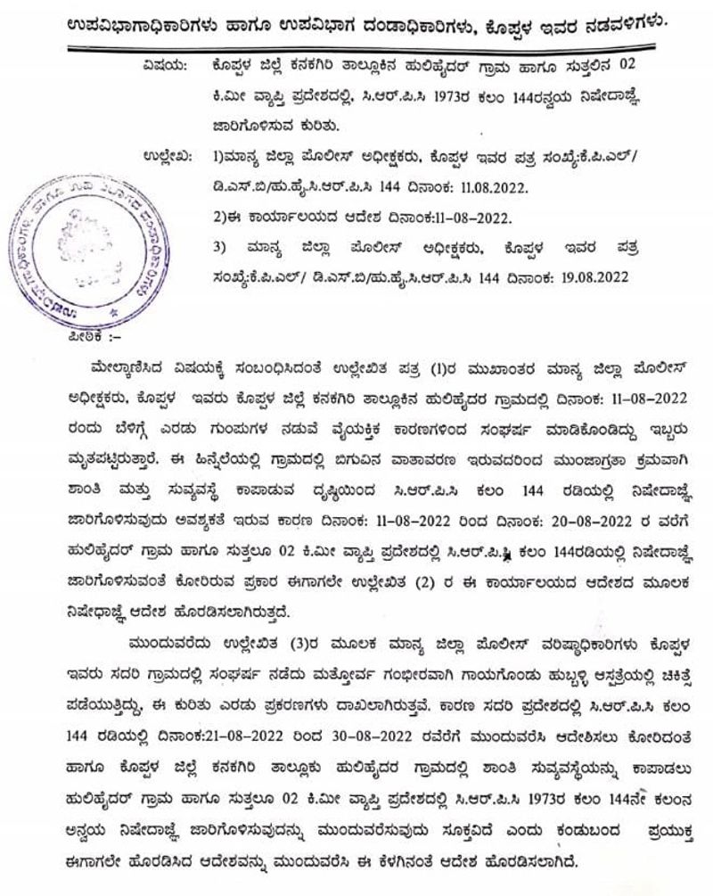 ಕೊಪ್ಪಳ ಜಿಲ್ಲೆ ಕನಕಗಿರಿ ತಾಲೂಕಿನ ಹುಲಿಹೈದರ್ ಗ್ರಾಮದಲ್ಲಿ ಆ. 11 ರಂದು ಎರಡು ಗುಂಪುಗಳ ನಡುವೆ ಮಾರಾಮಾರಿ ನಡೆದಿತ್ತು. ಮಾರಾಮಾರಿಯಲ್ಲಿ ಇಬ್ಬರು ಸಾವನ್ನಪ್ಪಿ, ಓರ್ವ ಗಂಭೀರವಾಗಿ ಗಾಯಗೊಂಡಿದ್ದನು. ಹೀಗಾಗಿ ಆ. 11 ರಿಂದ 20 ರ ವರೆಗೂ 144 ಸೆಕ್ಷನ್ ಜಾರಿ ಮಾಡಲಾಗಿತ್ತು.