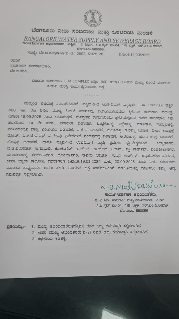 ಬಿ.ಡಬ್ಲ್ಯೂ.ಎಸ್.ಎಸ್.ಬಿ ಬಿಡುಗಡೆ ಮಾಡಿದ ಪ್ರಕಟಣೆಯಲ್ಲಿ, ಬಿ.ಬಿ.ಎಂ.ಪಿ ಕೈಗೊಂಡ ಕಾಮಗಾರಿಯ ಪರಿಣಾಮ ಪೈಪ್ಲೈನ್ ಕುಸಿದಿದ್ದು, ತುರ್ತು ದುರಸ್ತಿ ಕಾರ್ಯ ನಡೆಸಬೇಕಾದ ಪರಿಸ್ಥಿತಿ ಉಂಟಾಗಿದೆ ಎಂದು ತಿಳಿಸಿದೆ. ಕಾಮಗಾರಿಯನ್ನು ಶೀಘ್ರ ಪೂರ್ಣಗೊಳಿಸಲು ಸಿಬ್ಬಂದಿ ಹಗಲು-ರಾತ್ರಿ ಶ್ರಮಿಸುತ್ತಿದ್ದಾರೆ.