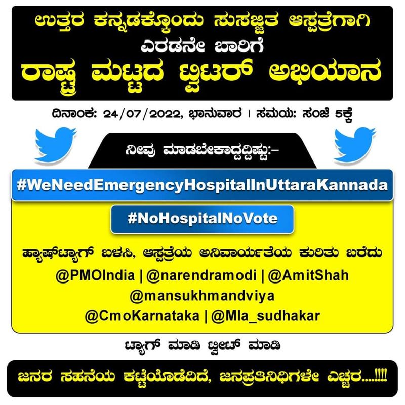 ಇತ್ತೀಚಿನ ಐದಾರು ವರ್ಷಗಳಲ್ಲಿ ರಸ್ತೆ ಅಪಘಾತಗಳಲ್ಲಿ ಗಾಯಗೊಂಡು, ಆಸ್ಪತ್ರೆಗೆ ಸೇರುವ ಮುನ್ನ ಮೃತಪಟ್ಟವರ ಸಂಖ್ಯೆಯೇ ಹೆಚ್ಚಾಗುತ್ತಿದೆ. ಅರೆಬರೆ ಹಾಗೂ ಅವೈಜ್ಞಾನಿಕ ಹೆದ್ದಾರಿ ಕಾಮಗಾರಿ ಹೆಚ್ಚಿನ ಅಪಘಾತಕ್ಕಾಗಿ ಕಾರಣವಾಗಿದೆ. ಹೀಗಾಗಿ 2019ರಲ್ಲಿ ಜಿಲ್ಲೆಯ ಕೆಲ ಯುವಕರು ಸೇರಿಕೊಂಡು ‘ವೀ ನೀಡ್ ಎಮರ್ಜೆನ್ಸಿ ಹಾಸ್ಪಿಟಲ್ ಇನ್ ಉತ್ತರ ಕನ್ನಡ’ ಹ್ಯಾಷ್ಟ್ಯಾಗ್ನಡಿ ಸಾಮಾಜಿಕ ಜಾಲತಾಣದಲ್ಲಿ ಟ್ರೆಂಡ್ ಮಾಡಿದ್ದರು.