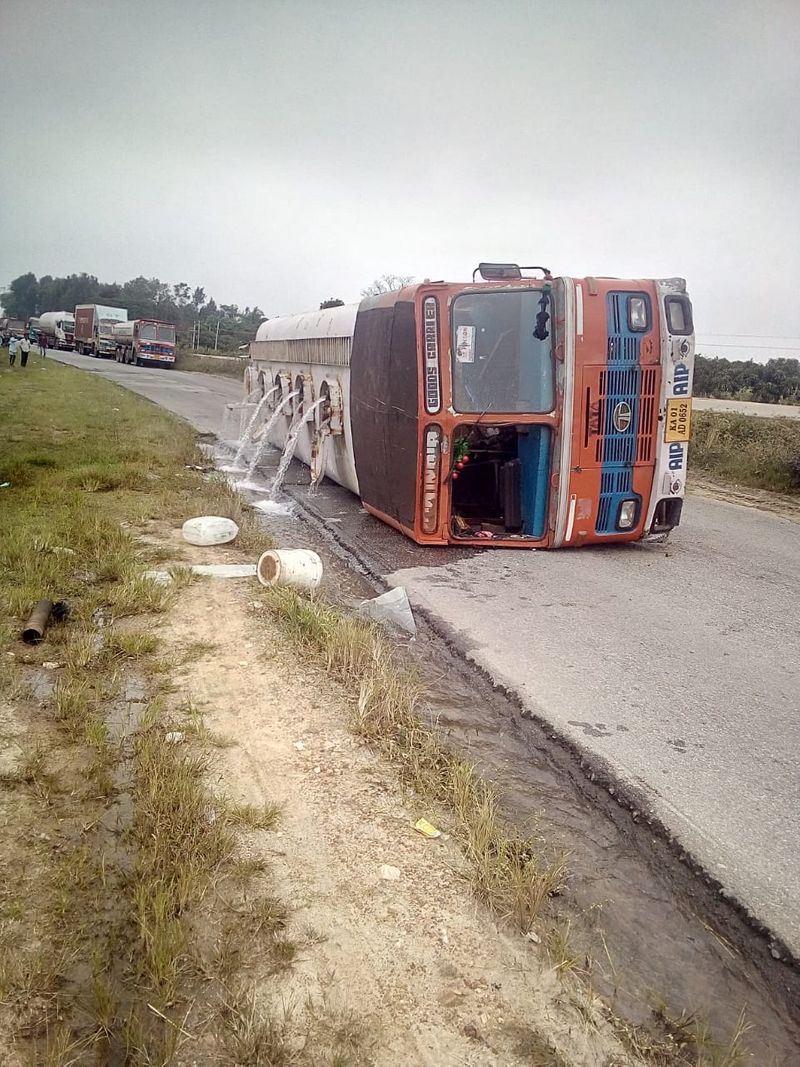 ಹದಗೆಟ್ಟಿರುವ ರಸ್ತೆಯಿಂದ ಚಾಲಕನ ನಿಯಂತ್ರಣ ತಪ್ಪಿ ಮಗುಚಿ ಬಿದ್ದಿದೆ. ಈ ವೇಳೆ ಅಪಾರ ಪ್ರಮಾಣದ ಡೀಸೆಲ್ ರಸ್ತೆಗೆ ಚೆಲ್ಲಿದೆ.