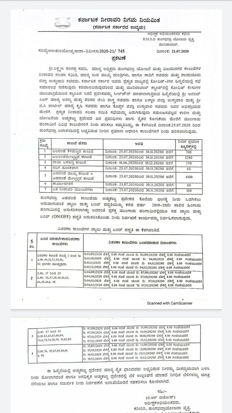 ತುಂಗಭದ್ರಾ ಜಲಾಶಯ ಭರ್ತಿಯಾಗಿದ್ದರಿಂದ ಕಾಲುವೆಗೆ ನೀರು ಬಿಡಲು ನಿರ್ಧಾರ ಮಾಡಲಾಗಿದ್ದು, ಜಲಾಶಯ ನೀರಿನ ಪ್ರಮಾಣ ಆಧಾರಿಸಿ ಕಾಲುವೆ ನೀರು ಬಿಡಲು ತೀರ್ಮಾಣಿಸಲಾಗಿದೆ. ಕೊನೆಯ ಭಾಗದ ರೈತರಿಗೆ ನೀರು ತಲುಪಿಸಲು ಚ್ಯಾಲು ಮತ್ತು ಬಂದ್ ಪದ್ಧತಿಯನ್ನ ಅನ್ವಯ ಮಾಡಲಾಗುವುದು. ತುಂಗಭದ್ರಾ ಅಚ್ಚುಕಟ್ಟು ಪ್ರದೇಶದ ರೈತರು ನೀರು ಮಿತವಾಗಿ ಬಳಸಲು ಸೂಚನೆ ನೀಡಲಾಗಿದೆ. ಬೆಳೆ ಉಲ್ಲಂಘನೆ ಮಾಡದೆ ನಿಗದಿ ಬೆಳೆಗಳನ್ನು ಮಾತ್ರ ಬೆಳೆಯುವಂತೆ ಆದೇಶದಲ್ಲಿ ಸೂಚನೆ ನೀಡಲಾಗಿದೆ.