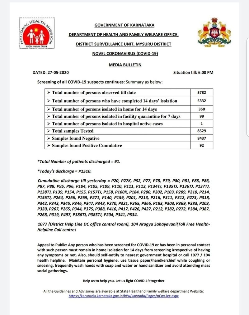 ಈವರೆಗೆ ಆಸ್ಪತ್ರೆಯಿಂದ 91 ಜನ ಬಿಡುಗಡೆಯಾಗಿದ್ದಾರೆ. ಉಳಿದ ಓರ್ವನಿಗೆ ಚಿಕಿತ್ಸೆ ಮುಂದುವರಿದಿದೆ. ಒಟ್ಟಾರೆ ಮೈಸೂರಿನಲ್ಲಿ 92 ಮಂದಿ ಕೊರೋನಾ ಸೋಂಕಿತರು ದಾಖಲಾಗಿದ್ದು, ಸದ್ಯ ಜಿಲ್ಲೆಯಲ್ಲಿ 350 ಮಂದಿ ಹೋಂ ಕ್ವಾರಂಟೈನ್ನಲ್ಲಿದ್ದಾರೆ. 7 ದಿನಗಳ ಫೆಸಿಲಿಟಿ ಕ್ವಾರಂಟೈನ್ನಲ್ಲಿ 99 ಜನರಿದ್ದಾರೆ.