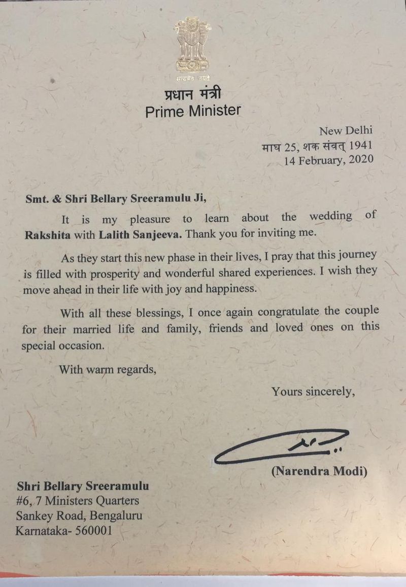 ಇದಕ್ಕೆ ಪತ್ರ ಬರೆದಿರುವ ಪ್ರಧಾನಿ ನರೇಂದ್ರ ಮೋದಿ ಅವರು, ತಮ್ಮನ್ನು ಆಹ್ವಾನಿಸಿದ್ದಕ್ಕಾಗಿ ಧನ್ಯವಾದಗಳು ಎಂದು ಹೇಳಿದ್ದಾರೆ. ಮದುವೆಯಲ್ಲಿ ಸಂಭ್ರಮ, ಸಂತೋಷ ಮನೆ ಮಾಡಿದೆ. ಅದರಲ್ಲಿ ನಾನು ಪಾಲ್ಗೊಳ್ಳಬೇಕೆಂದು ನಾನು ಬಯಸುತ್ತೇನೆ. ನವ ಜೋಡಿಗಳ ಹೊಸ ಜೀವನ ಸಂತೋಷದಿಂದ ಮುಂದುವರಿಯಬೇಕೆಂದು ನಾನು ಪ್ರಾರ್ಥಿಸುತ್ತೇನೆ. ರಕ್ಷಿತಾ ಹಾಗೂ ಸಂಜೀವ ರೆಡ್ಡಿ ಮತ್ತು ಕುಟುಂಬ, ಸ್ನೇಹಿತರು ಪ್ರೀತಿ ಪಾತ್ರರನ್ನು ಮತ್ತೊಮ್ಮೆ ಅಭಿನಂದಿಸುತ್ತೇನೆ ಎಂದು ಪತ್ರ ಬರೆದಿದ್ದಾರೆ.