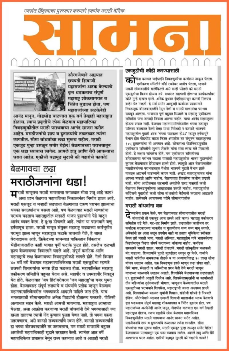 ಬೆಳಗಾವಿ ಮಹಾನಗರ ಪಾಲಿಕೆ ಚುನಾವಣೆ ಫಲಿತಾಂಶ ಕುರಿತು ಶಿವಸೇನೆ ಮುಖವಾಣಿ ಸಾಮ್ನಾದಲ್ಲಿ ಸಂಪಾದಕೀಯ ಪ್ರಕಟವಾಗಿದೆ. ಇದರಲ್ಲಿ 'ಬೆಳಗಾವಿ ಕದನ, ಮರಾಠಿ ಜನರಿಗೆ ಪಾಠ!' ಎಂಬ ಅಡಿ ಬರಹದಲ್ಲಿ ಬರೆಯಲಾಗಿದೆ. ಛತ್ರಪತಿ ಶಿವಾಜಿ ಮಹಾರಾಜರ ಹೆಸರು ಬಳಸಿ ಬೆಳಗಾವಿಯ ಮರಾಠಿಗರ ಹಾದಿ ತಪ್ಪಿಸಲು ಶಿವಸೇನೆ ಕುತಂತ್ರ ನಡೆಸುತ್ತಿದೆ.
